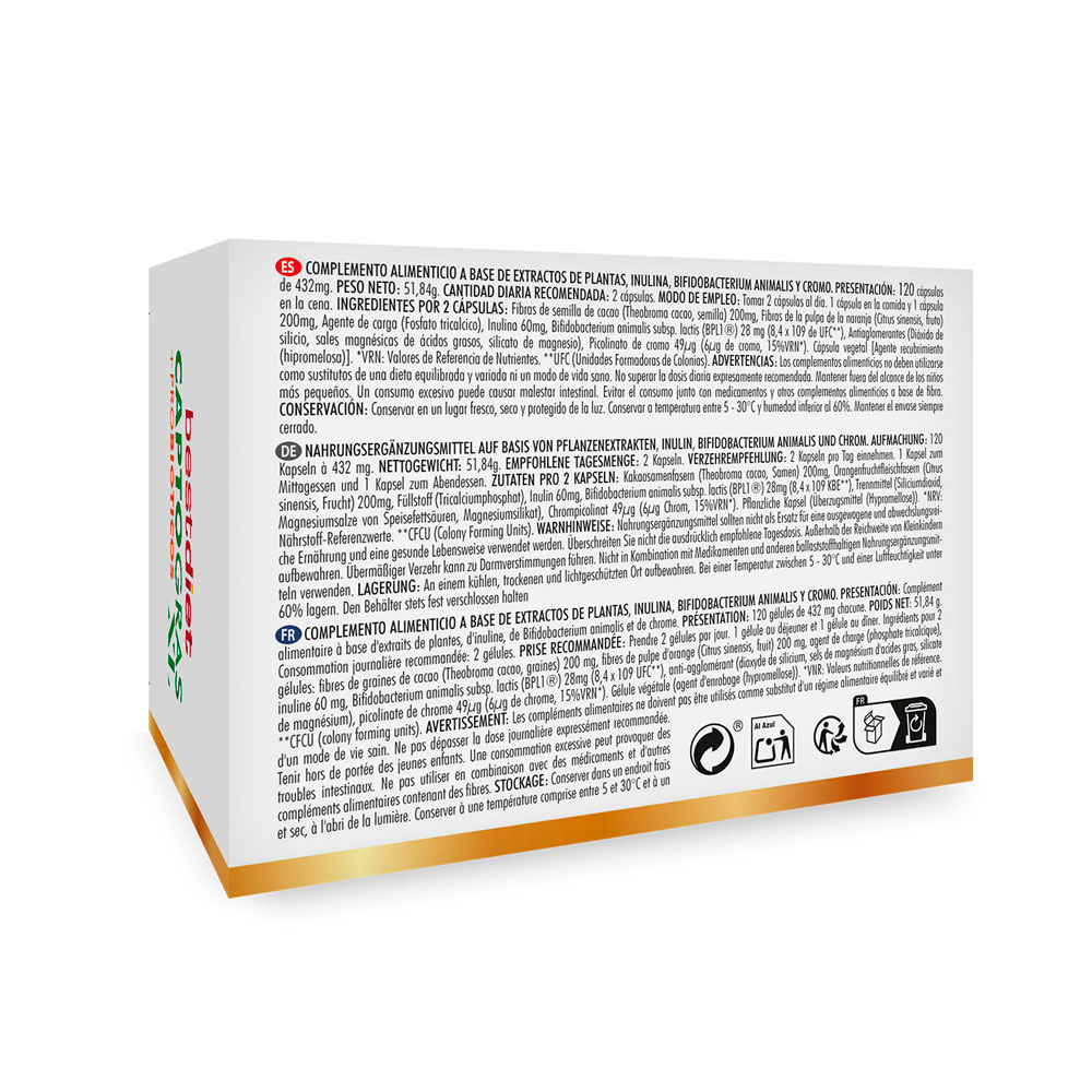 Ingredientes por 1 cápsula: Fibras de semilla de cacao (Theobroma cacao, semilla) 200 mg, Fibras de la pulpa de la naranja (Citrus sinensis, fruto) 200 mg, Agente de carga (Fosfato tricalcico), Inulina 60 mg, Bifidobacterium animalis subsp. lactis (BPL1®) 28 mg (8,4 x 109 de UFC**), Antiaglomerantes (Dióxido de silicio, sales magnésicas de ácidos grasos, silicato de magnesio), Picolinato de cromo 49 µg (6 µg de cromo, 15%VRN*). Cápsula vegetal [Agente recubrimiento (hipromelosa)].