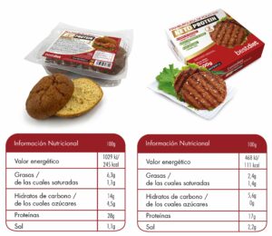 Carne de pollo (54%), Agua, Proteína de SOJA, Sal, Fibras vegetales, Especias, Cebolla frita (cebolla y aceite de oliva), Ajo, Estabilizantes (celulosa, goma xantana, carboximetilcelulosa sódica, trifosfatos), Aromas, Potenciador del sabor (glicina), Colorante caramelo natural, Antioxidante (eritorbato sódico), Colorante (ácido carmínico) y Conservador (nitrito sódico).