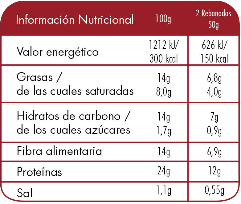 Mix panario (49,8%): [(Proteína de TRIGO, Proteína de SOJA, Proteína de ALTRAMUZ, Harina de SOJA, Semillas de linaza marrón y amarilla, Semillas de girasol, Harina de TRIGO integral, Salvado de TRIGO, Fibra de manzana, Semillas de SÉSAMO, Sal, Harina de malta de CEBADA tostada, Emulsionante (lecitina de SOJA), Regulador de la acidez (diacetato de sodio)], Agua, Mix de fibras (Fibra de Bambú, Inulina, Fibra de TRIGO), Aceite de girasol alto oléico, Fécula de patata, Almidón de arroz, Aroma (Aroma de pan) y Conservadores (Propionato cálcico y Ácido sórbico).