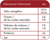 - Baja en carbohidratos y azúcares (solo 2,3 g de carbohidratos por 100 g).
